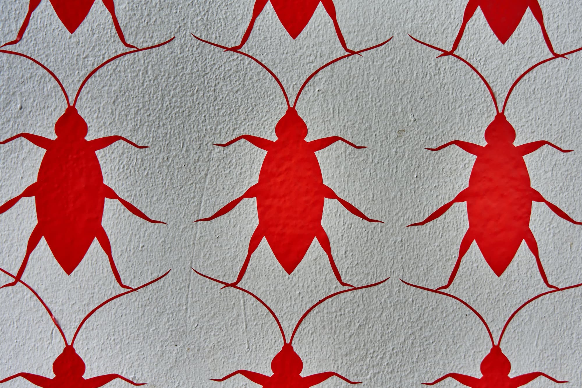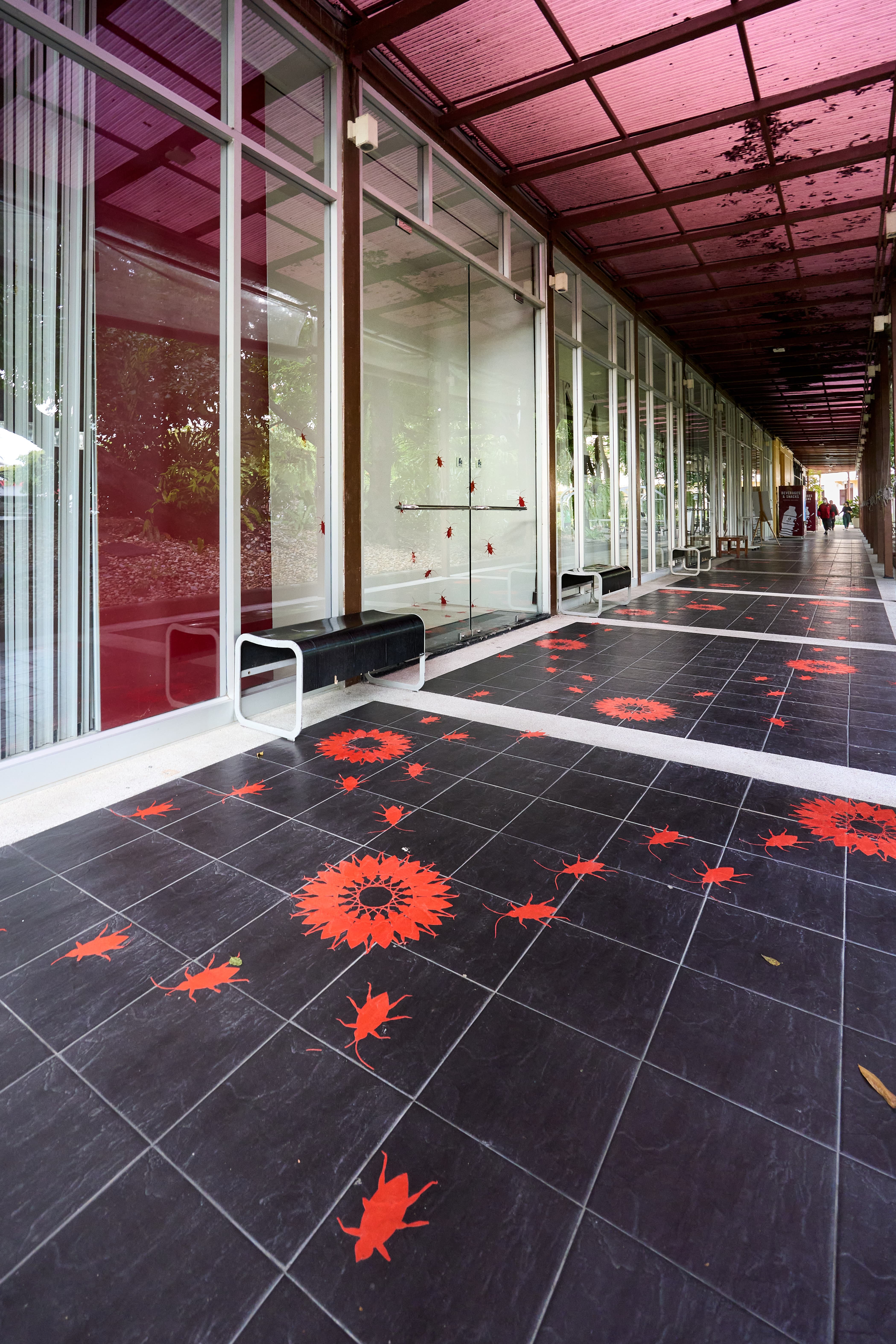 For the Bangkok Art Biennale Qayyum creates a site-specific installation using her cockroach motif. Crawling around the Museum Siam’s premises, her distinctive cockroach pattern appears on the building's neoclassical facade as well as on the surrounding garden pathway, informing the history of this landmark site with notions of resilience and resurgence. Responding to BAB curatorial theme of Chaos: Calm, which invites us to reflect on the recent global crisis of the pandemic, unjust wars and the traumatic aftermath of fear, destruction and death, her work functions as a reminder that our survival depends on coming together and on community building. The resulting installation, while conferring to the building a veil of grotesque beauty, serves as a gesture of encouragement and hope by mirroring the efforts of a community to function together for survival and growth through the social and political complexities of our time. In this context her use of the socially rejected household pest, the cockroach, as a landmark motif of her work acquires poignant significance to symbolize endurance, and continuance.